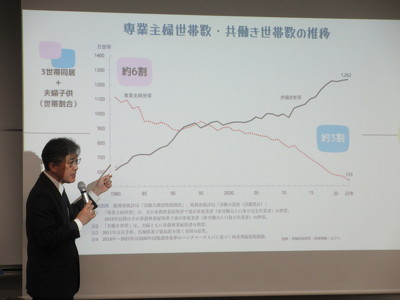 また、愛知県内の雇用情勢、労働時間、年次有給休暇取得率のほか、管理職に占める女性労働者の割合や、男女間賃金格差のデータを紹介。労働局が取り組む賃金引上げのための環境整備やリ・スキリング (新しい職業に就くために、あるいは、今の職業で必要とされるスキルの変化に適応するために、必要なスキルを獲得すること)、女性活躍や多様な働き方のための支援について解説しました。