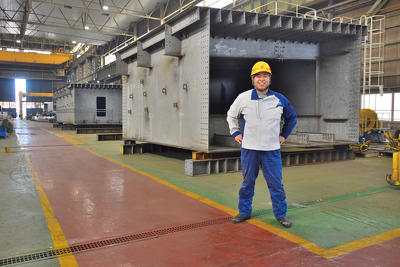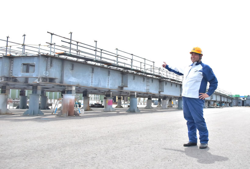 実際の製作に入ってからだけでも、およそ3年の歳月を費やしたというビッグプロジェクト。「あれだけ大きな物を造るわけですから、橋梁を構成するための大中小、様々なボックスが必要になります。人が一人、ようやく入れるような小さなボックスの中で熱量を直に浴び続けながら溶接をしたり、大きなボックスの一辺だけの溶接に気が付いたら一日かかっていたり。工場の敷地内で仮組された状態の橋を見た時は、ようやく終わったという達成感と同時に、検査で不具合が出ないでほしいと祈るような思いでした。」