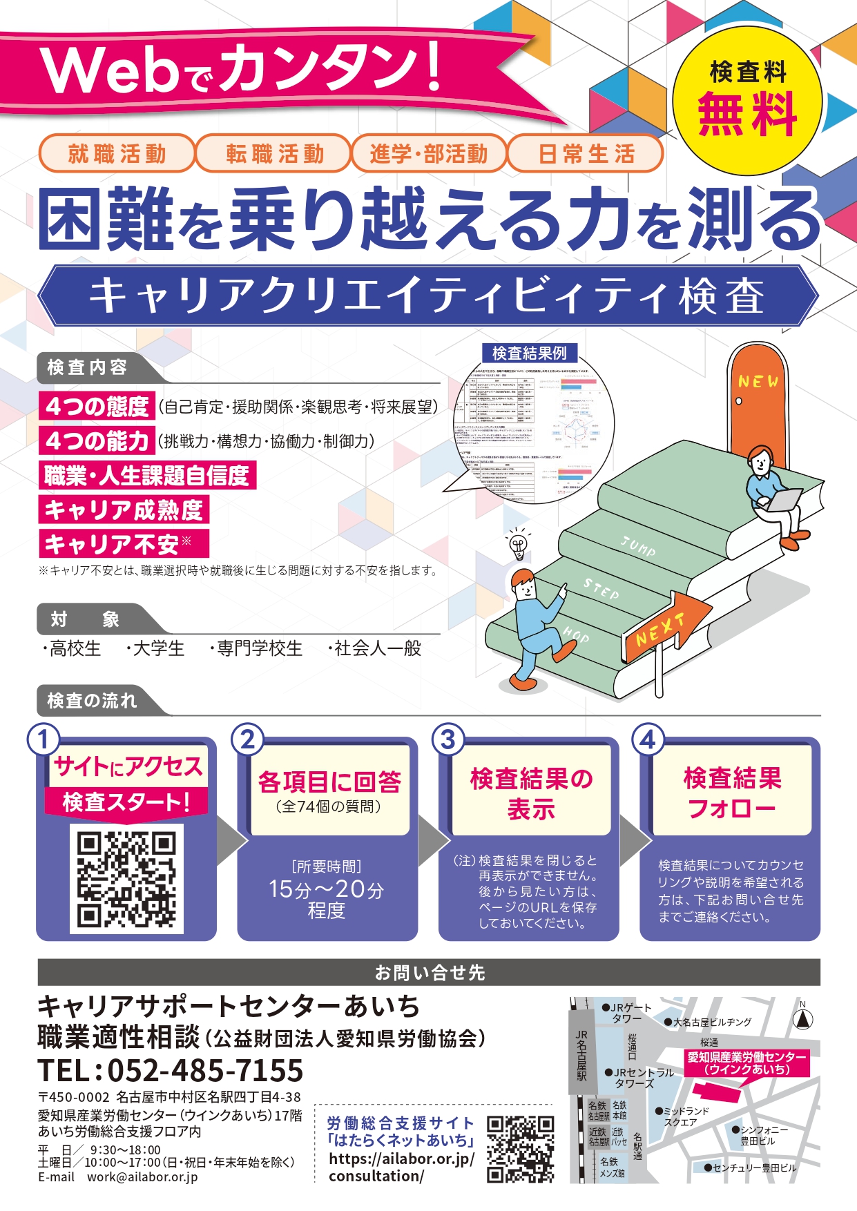 窓口での相談や無料の適性検査は予約不要で受け付けます。