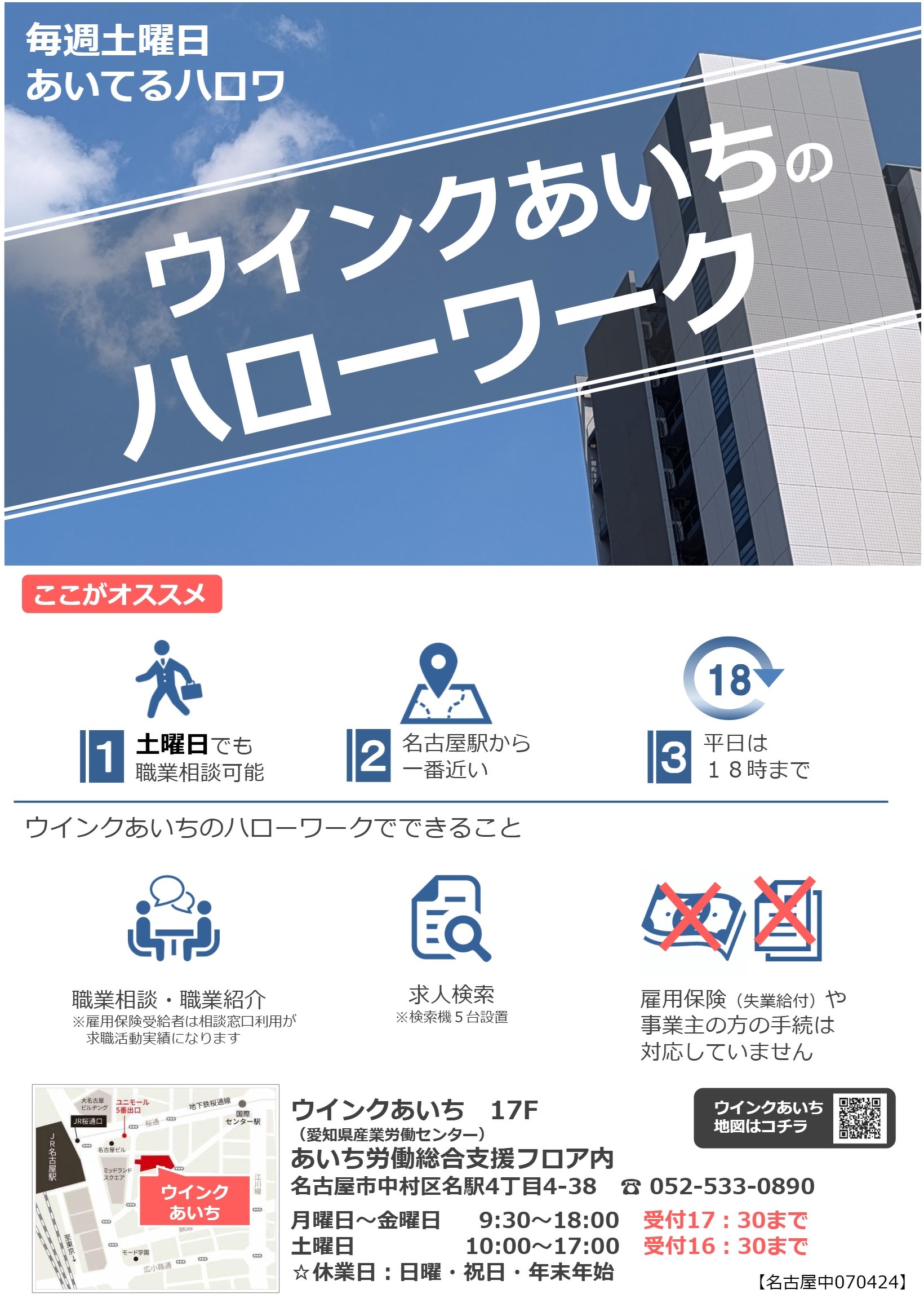 - A 在学中の方を対象とした職業紹介は実施しておりません。ハローワーク名古屋中(ヤマイチビル)9階にある若者向けの就職総合支援施設である「ヤング・ジョブ・あいち」をご利用ください。