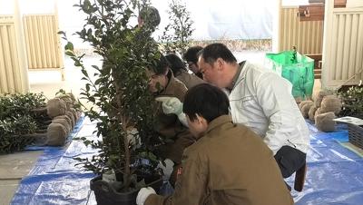 ポイントを教わりながら枝を切る生徒たち(造園)