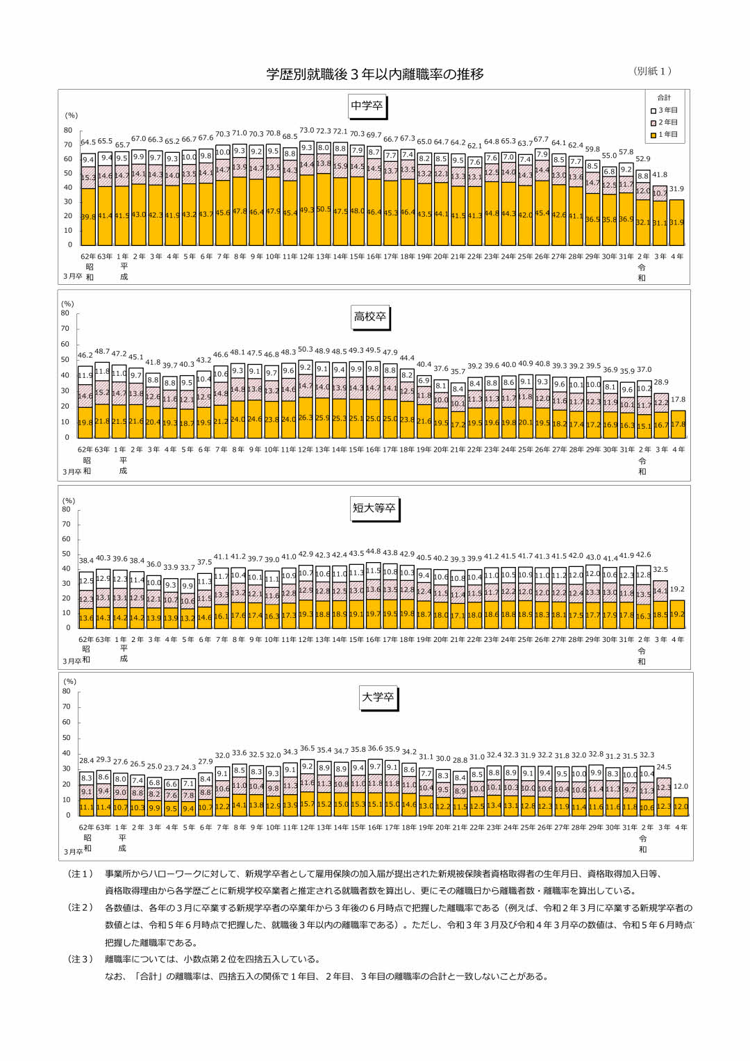 現在はその状況が少し変わってきており、2020年の状況では中卒就職者では52.9%、高卒就職者では37.0%、大学就職者では32.3%となっていて、中卒や高卒の3年以内離職率は減少傾向にあります。
