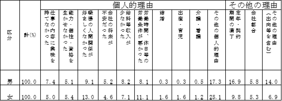 では労働者が離職してしまう理由はどのようなものでしょうか、まずは厚生労働省が公表している個人的理由における離職理由の調査を見てみましょう。