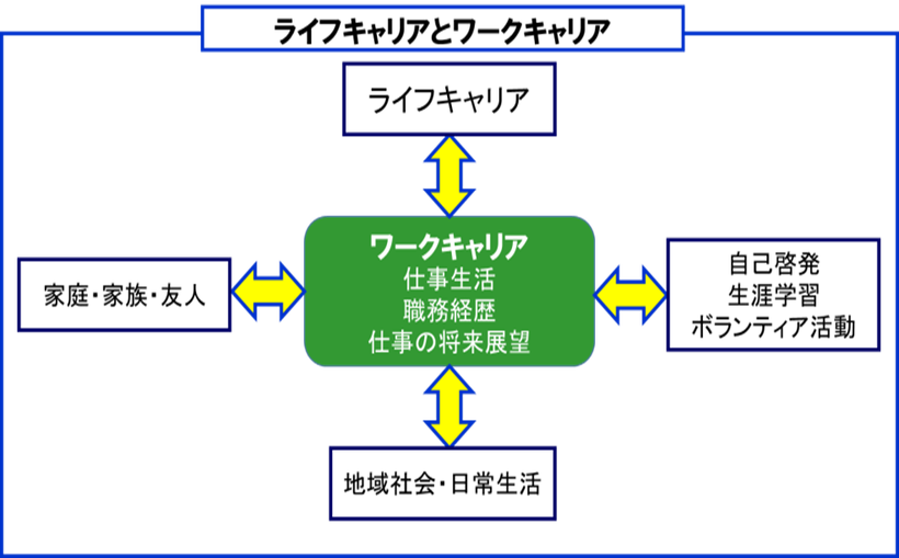 キャリアには二つの領域があります。ひとつ目は、ワークキャリアといい、仕事人生のことであり、仕事に関する職務経歴及び将来の展望見込み(将来ビジョン)などのことです。もうひとつはライフキャリアと呼ばれているもので、仕事以外の生活のことで、家族・家庭・友人や地域社会における個人の活動のことです。もっとも、家族の介護や子どもの教育などが仕事に対して影響を及ぼすことから、結果として、ふたつのキャリアは相互関連しながら、キャリア形成が図られていくことになります。そしてこれらを支えているのが、逆説として、稼得のため働くこと、ワークキャリアの形成ということです。現役で仕事をしている間はもちろんのこと、リタイヤ後も稼得実績は年金に繋がっていくので、目が離せませんね。
