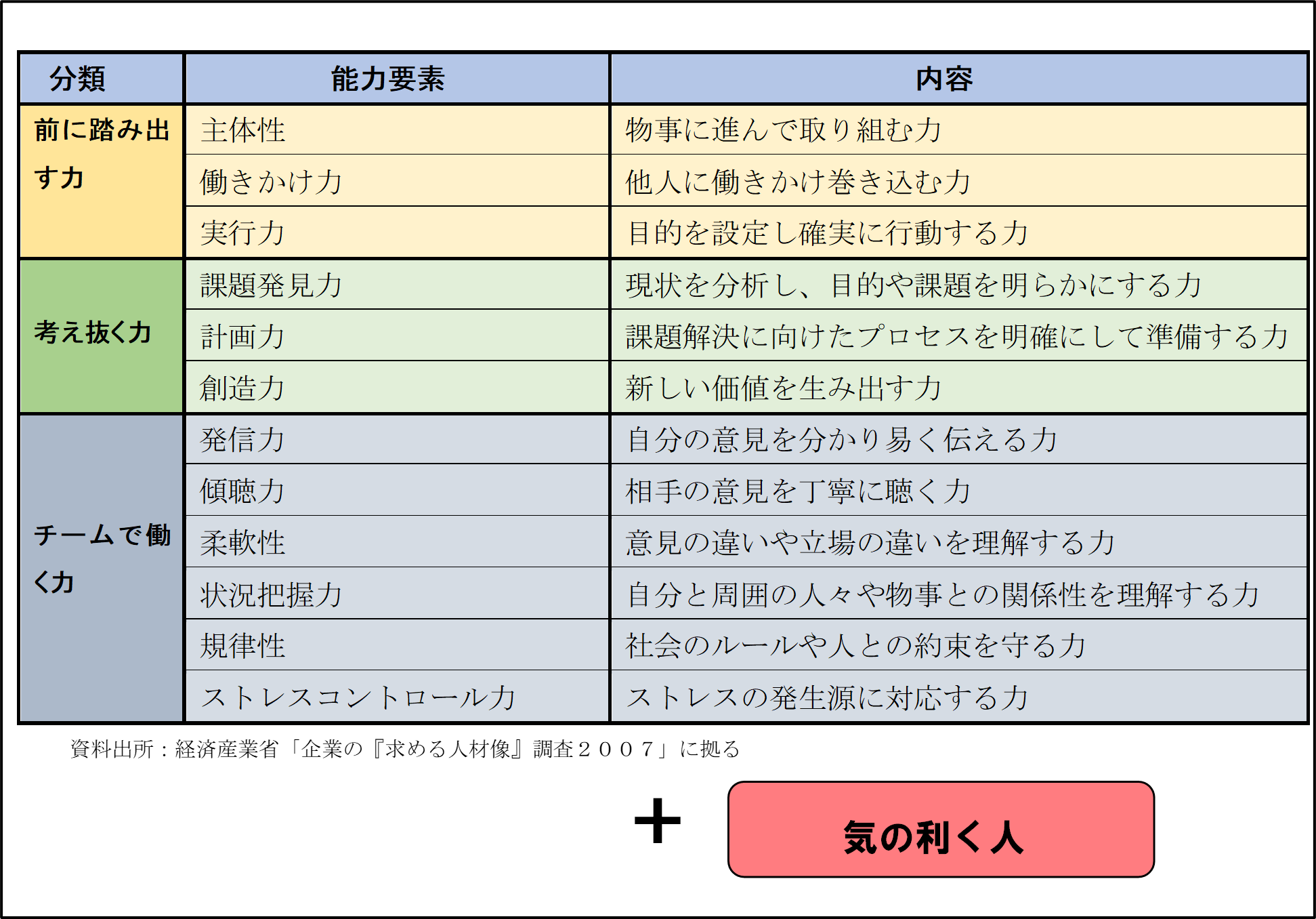 そして課題解決スキルのキーワードは、何といっても「気の利くヒト」であり、気の利くヒトは単なる性質のことではなく、気が利くことが課題発見の基底だからです。これは、平成18年に経済産業省が提唱した、「前に踏み出す力」「考え抜く力」「チームで働く力」といった、社会に出てからも渡り合っていける、あるいは様々な場面で活躍できるとされる三つの能力である社会人基礎力に、プラスワンする位置づけにあります【図を参照】。