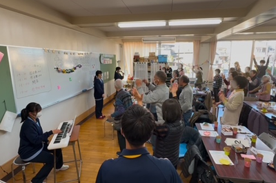 考案した健康体操を高齢者と一緒に行う