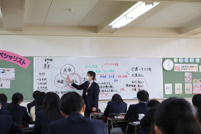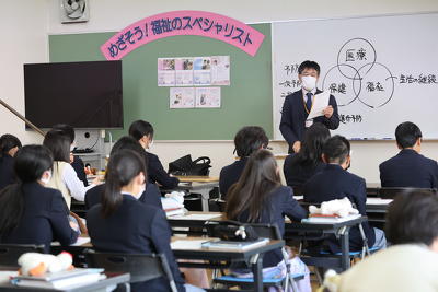 授業では、「医療」「保健」「福祉」のそれぞれの基本的な考え方や違いなどを学んでいました。例えば、医療の提供を受ける人を「患者」と呼ぶのに対し、介護を受ける人は「利用者」と呼びます。これは、介護では対象者を管理するのではなく、生活の主体者である本人の意向を尊重するという考え方に基づくものです。生徒たちは、介護業界を目指すうえで重要となるこうした根本的な理念について、しっかりと理解を深めている様子でした。