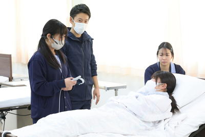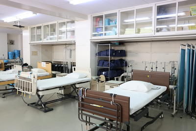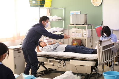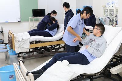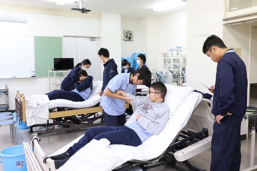 続いて、1年生の「生活支援技術」の科目で行われている「着脱実習」を見学しました。生徒が3~4名で1つのグループを組み、「介護者役」、「利用者役」、「手順の読み上げ役」に分かれ、現場で使われているのと同じ仕様の介護用ベッドを用いて、衣服の着脱を行うロールプレイ形式の実習が行われました。