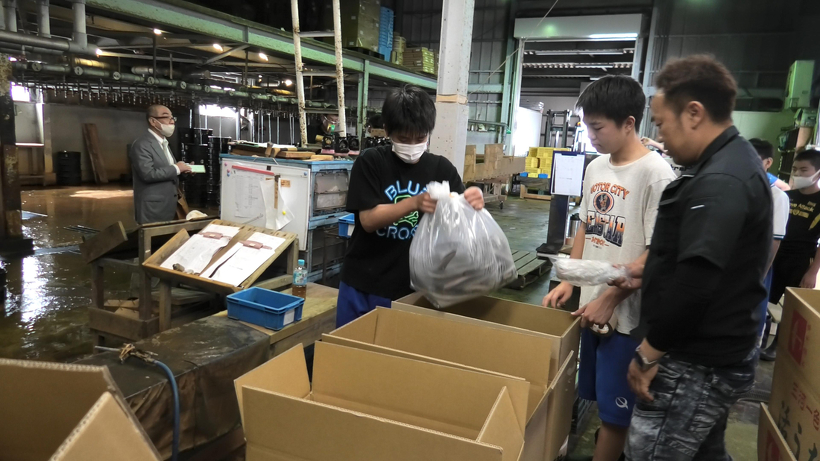 午後は出荷作業のお手伝いです。みんなの担当は、うなぎの入ったビニール袋をダンボール箱に詰めて閉じ、出荷用の台に運ぶ作業。こうして貴重な職場体験の2日間を無事に終えました。