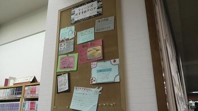 職場体験に来た生徒手作りのPOP(ポップ:おすすめの本を紹介するカード)が掲示されている