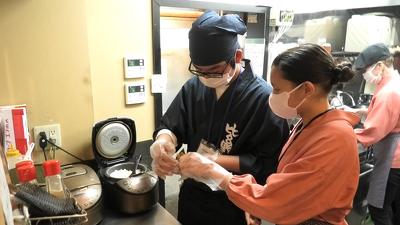 ご飯の量やのりの巻き方などを教えあいながら天むすを握る生徒たち