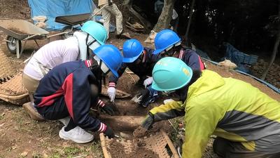生徒たちは、30人ほどの作業員とともに発掘調査にあたりました。