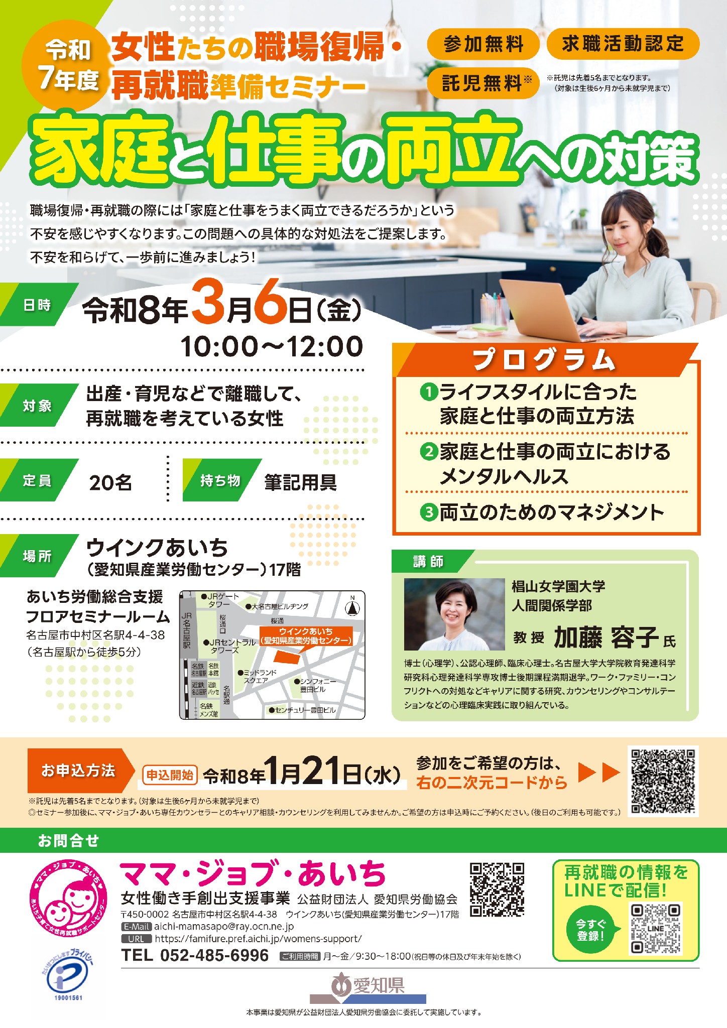 出産・育児などで離職した女性の方に、セミナーや職場見学、就職説明会などを通じて再就職をサポート